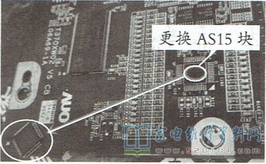 接修一台TCL L37M61B型液晶彩电,图像花屏,如图1所示。首先清洗上屏线触点后试机,故障依旧。检测逻辑板,发现伽马校正块型号为AS15。根据经验,AS15易损坏从而引起花屏故障。更换AS15后试机(见图2),故障排除。