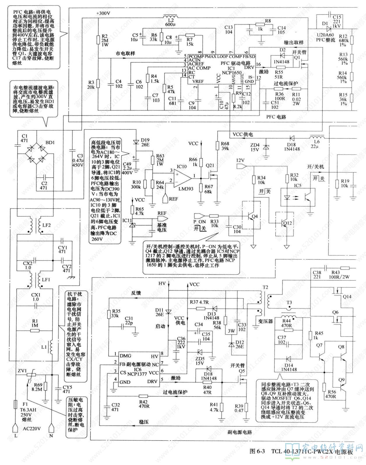 该电源板集成电路采用NCP1377 (IC6) + NCP1650 (IC1) + NCP1217 (IC2) 组合方案。