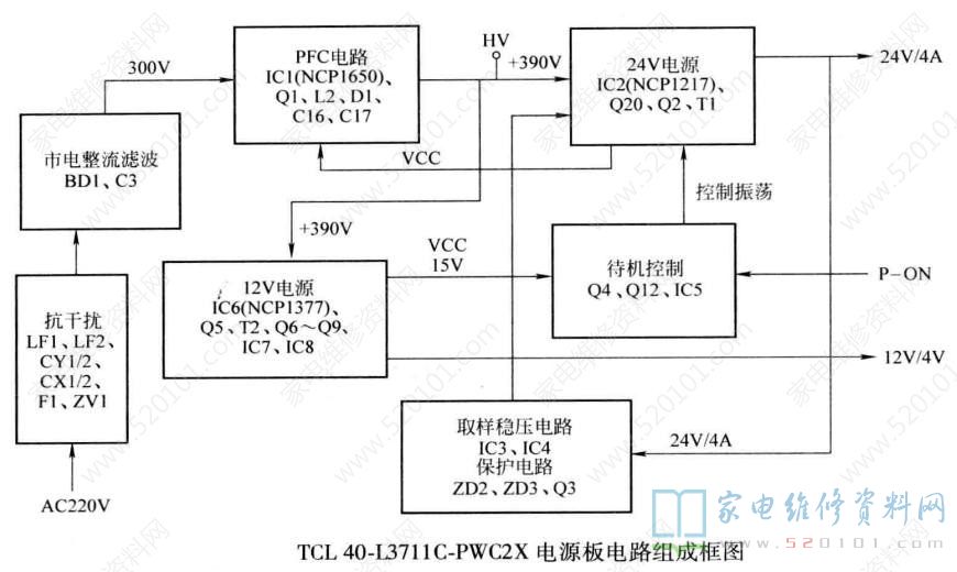 TCL液晶彩电采用的40-13711C-PWC2X电源板,因输出电压和连接器的差异,有PWC2X、PWD2X、PWF2X等几种型号。型号为40-LD3726-PWF2X电源板,与40-13711C-PWC2X电源板电路结构相同,可相互代换。该系列电源板 应用于TCL 40A71-P、LCD37A71-P、LCD32A71-P、 LCD37 B66-P、LCD32B66-P 等液晶彩电中,其中40in液晶彩电配LTA400W2-LO1显示屏。TCL 40-13711C-PWC2X电源板实物图解如图1所示;电路组成框图如图2所示。