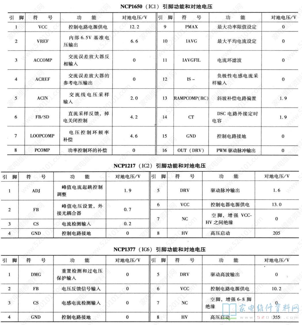 该电源板的集成电路引脚功能和对地电压见表1 ~表3。