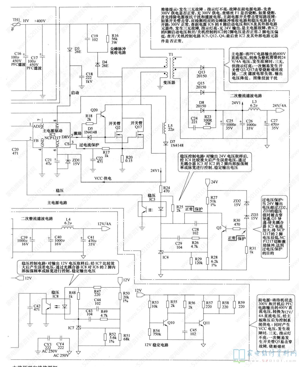 该电源板由三部分组成: 一是以驱动控制电路NCPI377 (IC6) 和大功率MOSFET (开关管) Q5 为核心组成的副电源,为主板提供+12V电压,降压后向微处理器控制系统供电,同时为开关机电路提供VCC工作电压;二是以驱动控制电路NCP1650 (IC1) 和大功率MOSFET (开关管) Q1 为核心组成的PFC电路,校正后将市电整流滤波后的电压提升到400V;三是以驱动控制电路NCPI217 (IC2) 和大功率MOS-FET (开关管) Q2、Q17为核心组成的主电源,为负载电路提供+24V的电压。