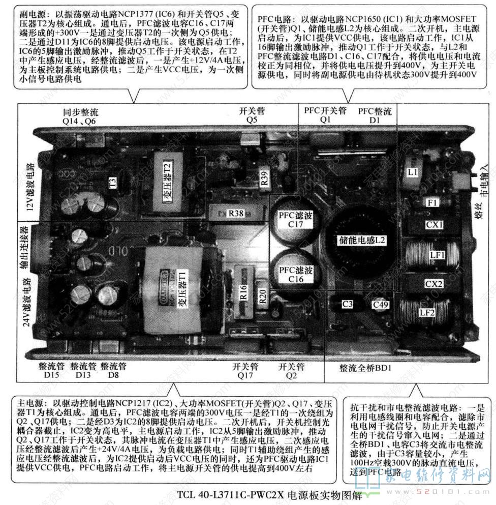 TCL 40-13711C-PWC2X电源板发生故障时,主要引起开机无光栅、无图像、无声音的三无故障。如果发生故障时指示灯不亮,此类故障大多是由PFC电路或12V开关电源出现故障引起。如果指示灯亮,且伴音正常,只是黑屏幕,则是24V关电源故障。