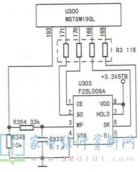 一台L42E77 型液晶彩电,上电后待机指示灯亮,但不开机。接通电源开关,按下遥控器上的“开/待机”键(或面板“频道+/-”键),测主板上插座P803⑥、⑧脚已有+12V电压,说明主电源输出正常,同时也说明U300(MST6M19GL)205脚已输出低电平开机信号。不能二次开机,说明MCU不能正常运行开机程序,于是对U300的内核电路工作的+1.26V外接程序存储器U303 ( F25L008A)的+3.3V 、DDR存储器U304的+2.5V工作电压进行检查,未发现异常。查U300的总线端口104、105脚电压为波动的4.8V,180、181脚电压为波动的3V,均正常,但170、171脚电压为稳定的+1.2V,正常时应为波动的+3V电压。U300 的总线端口170、171脚接U303的①、②脚,如图1所示。检查相关电阻无异常,换上存有原始数据的U303后试机,故障消失。