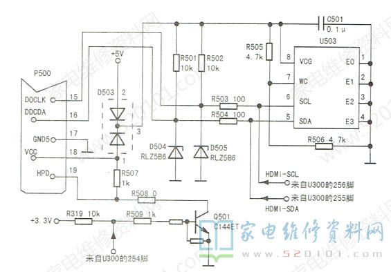 接修一台SL42M6型液晶彩电,故障表现为HDMI状态下无图像。该机在其他状态下图像正常,表明HDMI输入电路,或者负责HDMI正常工作的EDID芯片U503 ( M24C02)未能正常工作(它主要存储有HDMI信号显示格式等相关信息),或者主控芯片内部的信号切换电路存在问题。首先用遥控器切换信号源至HDMI状态,测控制管Q501的基极有高低电平变化,HDMI信号输入插座P500的19脚(HPD端子)为正常的高电平,表明HDMI信号的输入和接收电路已准备进入工作状态。接下来测量U503⑤、⑥脚总线电压,发现时钟线电压为3.3V,但数据线电压却为oV。经查,数据线的上拉电阻R502( 10kΩ)已开路,相关电路如图1所示。换新后试机,故障排除。
