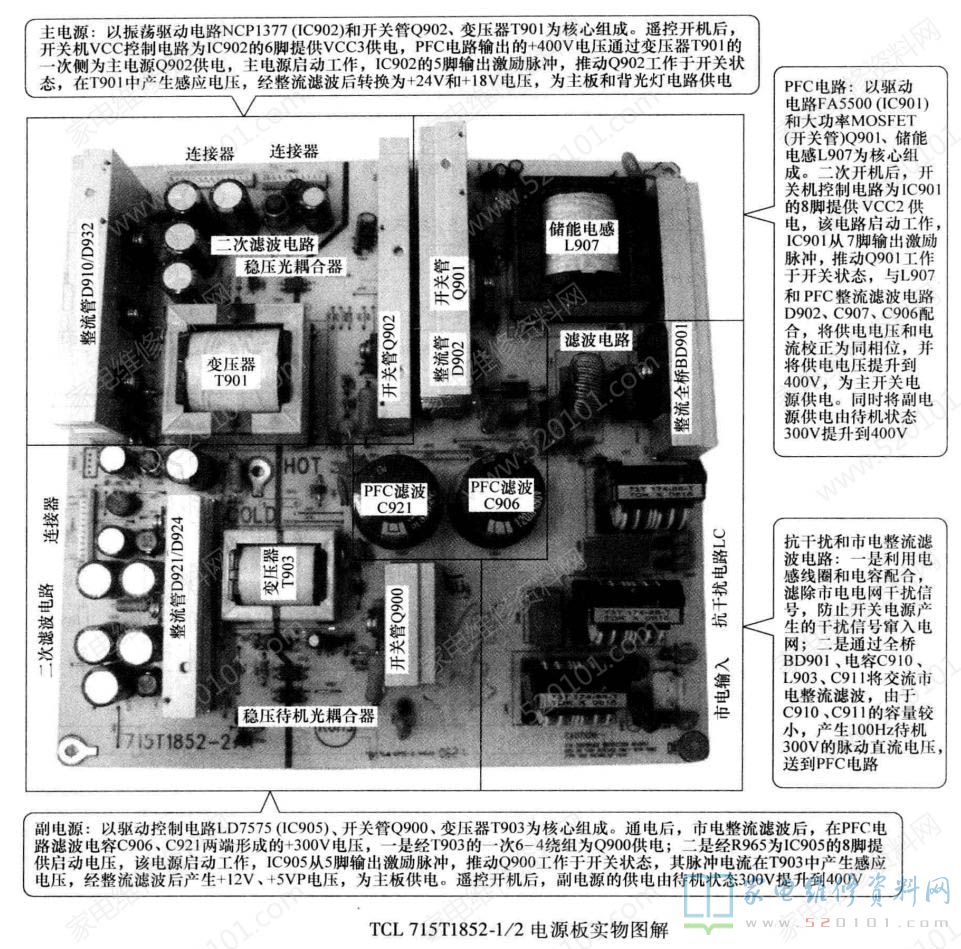 TCL液晶彩电采用的715T1852-1和715T1852-2电源板,两者电路组成和电路结构相同,可互相代换使用,应用于TCL LCD37K72等液晶彩电中。TCL 715T1852-1/2电源板实物图解如图1所示;电路组成框图如图2所示。