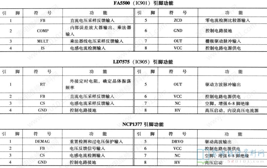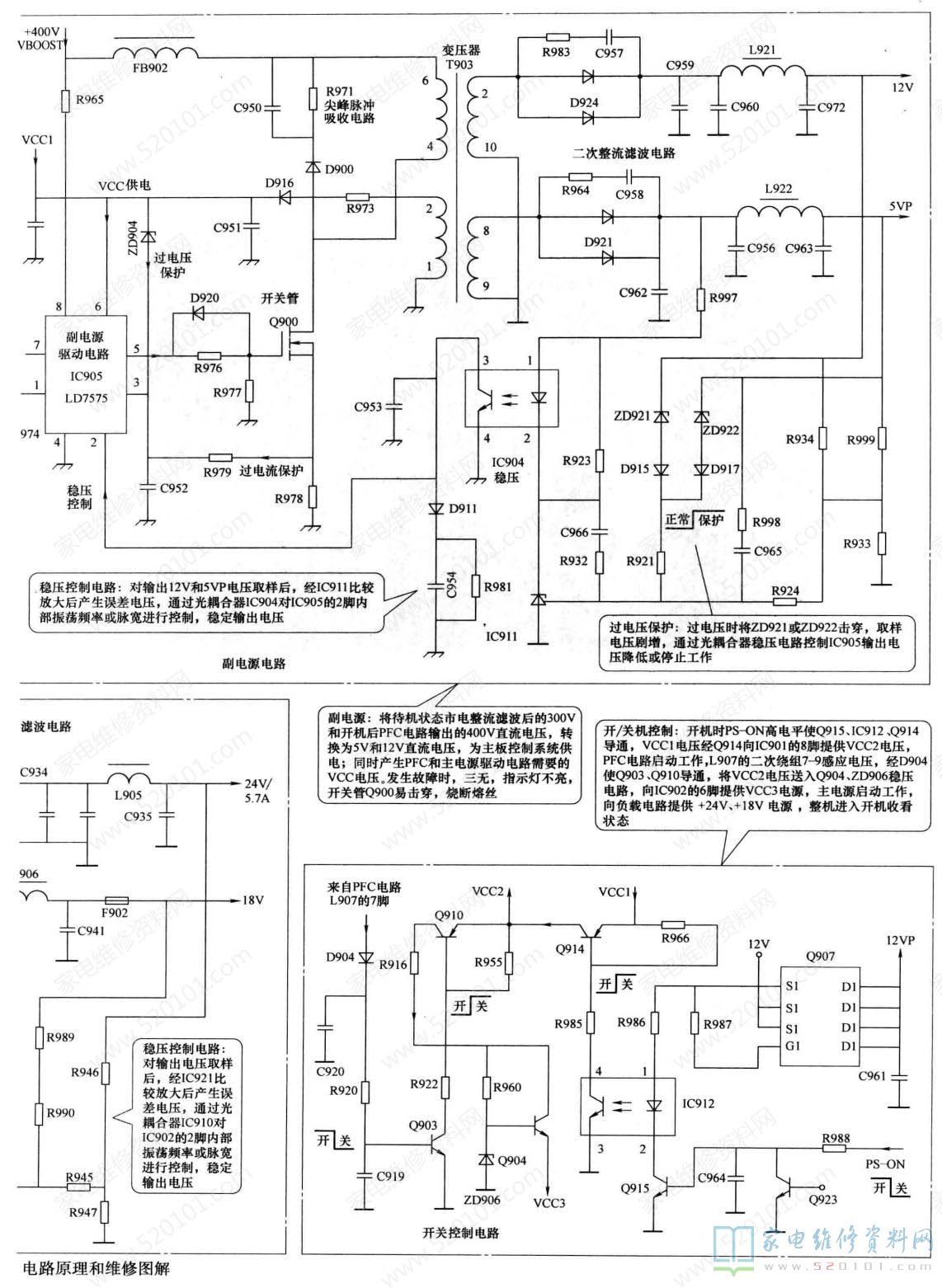 该电源板集成电路采用FA5500 (IC901) + LD7575 (IC905) + NCP1377 (IC902) 组合方案。该电源板由三部分组成:一是以驱动控制电路FA5500(IC901)与外围电路组成的有源PFC电路:二是以驱动控制电路LD7575(IC905)与外围电路组成的副电源;三是以驱动控制电路NCP1377( IC902)与外围电路组成的主电源。开关机采用控制PFC电路IC901和主开关电源驱动控制电路IC902供电的方式。
