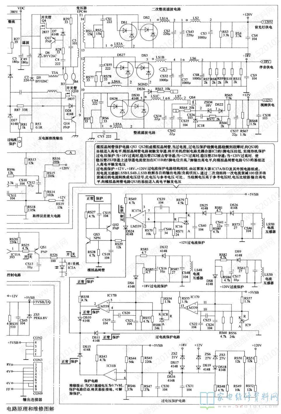 如果开机的瞬间主开关电源有电压输出,然后降到0V,则是保护电路启动引起。如果测量模拟晶闸管QS3的基极电压由正常时的0V变为0.7V以上,则是该保护电路启动。全部解除保护:将QS3的基极对地短路。逐路解除保护:逐个断开取样电路QS3基极之间的连接隔离二极管DS15、DS10、DS11,如果断开哪路保护检测电路的隔离二极管后,开机不再保护,则是该路保护检测电路引起的保护。TCL JSK4330-007电源板电路原理和维修图解如图3所示。
