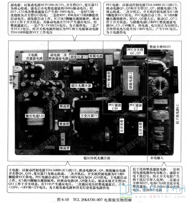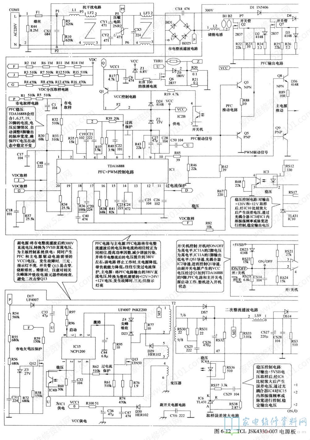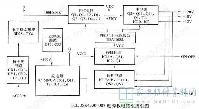 TCL液晶彩电采用的JSK4330-007电源板,集成电路采用NCP1200+TDA16888组合方案,应用于TCL LCD40B66-P、LCD42B66-P、 LCD42B03-P等液晶彩电中,40in液晶彩电配LTA400WT-LI1显示屏。TCL JSK4330-007电源板实物图解如图1所示;电路组成框图如图2所示。