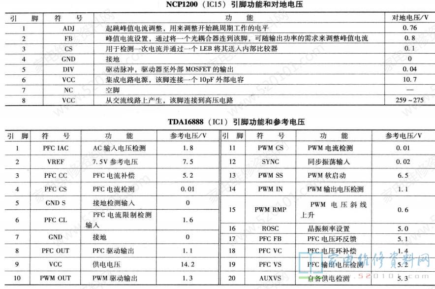 该电源板设有多种保护方案,一是在副开关电源一次电路, 设有过电压、过电流保护电路;二是在主开关电源的一次电路,依托TDA16888的保护功能,设有过电压、欠电压、过电流保护电路;三是在主开关电源的二次侧设有以模拟晶闸管QS2、QS3 电路为核心的过电流、过电压保护电路,保护电路启动时,QS2、QS3导通,迫使VCC控制电路截止,切断送到IC1的VCC电压。该电源板的集成电路引脚功能和对地电压见表1、表2。