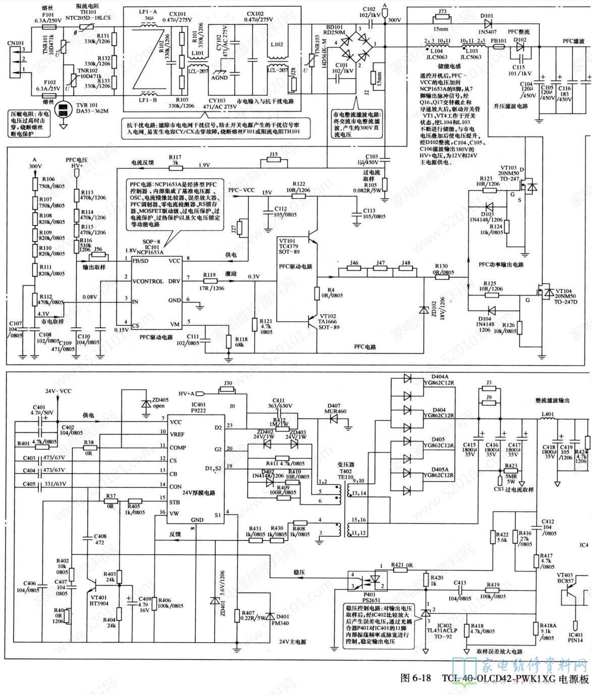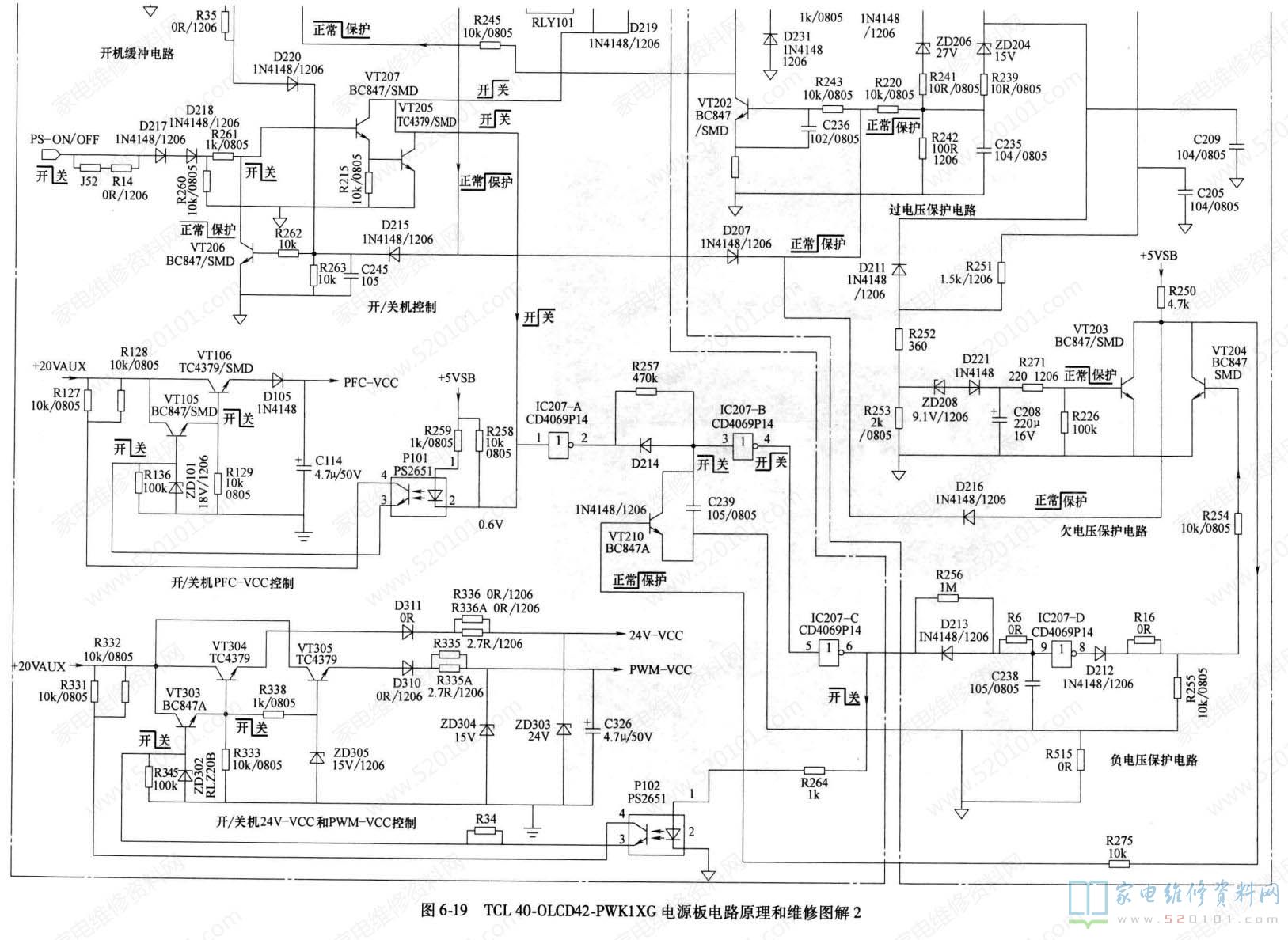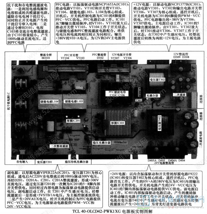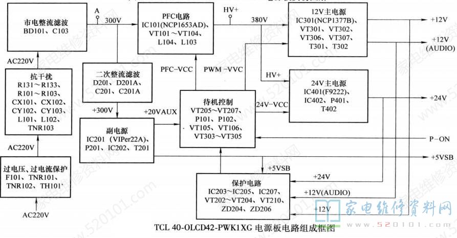 注意:断开各路保护电路隔离二极管后,不可长时间通电,以免引起元器件损坏TCL40-DLCD42-PWK1XG电源板电路原理和维修图解如图3、 图4所示。