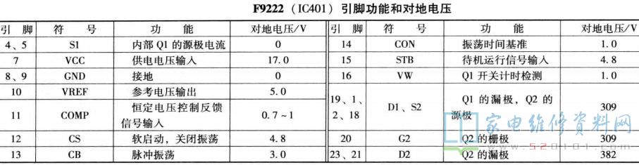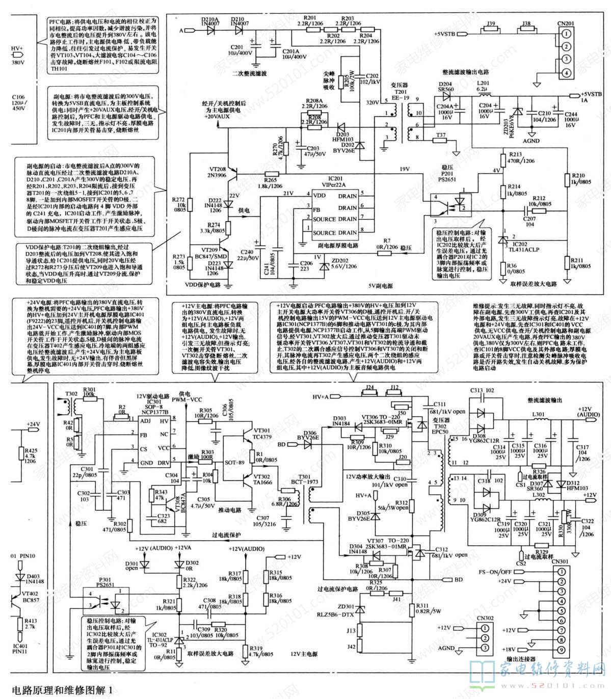该电源板由四部分组成: 一是以厚膜电路VIPer22A (IC201)为核心组成的副开关电源,为主板上微处理器控制系统提供+5VSB供电,同时为PFC电路和主开关电源驱动控制PWM电路提供+20VAUX的VCC工作电压;二是以驱动控制电路NCP1653A (IC101) 和大功率MOSFET (开关管) VT103、 VTI04为核心组成的PFC电路,校正后为主开关电源提供约380V的HV工作电压;三是以驱动控制电路NCP1377B (IC301)和大功率MOSFET (开关管) VI306、 VI307 为核心组成的12V主开关电源,为负载电路提供12V (AUD-0)、12V 电压:四是以厚膜电路F9222 (IC401 )为核心组成的24V主电源,为负载电路提供24V的电压。