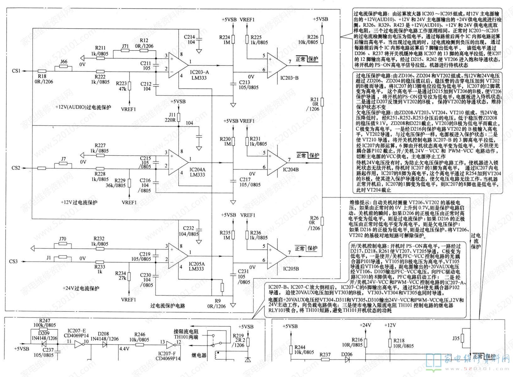 由于 VT202的基极外接过电压保护和欠电压保护两种保护检测电路,为了确定是哪路保护检测电路引起的保护,可在自动关机前的瞬间通过测量D216正极电压来确定。如果D216的正极电压为高电平,则是欠电压保护电路启动,应检查+24V、+12V整流滤波电路是否发生开路故障,负载电路是否发生短路、漏电故障;否则是过电压保护电路启动,对可能引起开关电源输出电压升高的稳压控制电路的元器件进行检测。对于过电流保护电路,可测量D206的负极电压判断保护电路是否启动。D206的负极电压正常时为高电平,果开后保护护前的瞬间D206的负极电压为低电平,则是过电流保护电路启动,应检查负载电路是否发生短路漏电故障,可拔掉连接器CN301,接假负载对开关电源电路进行检修,判断故障是在负载还是在开关电源。