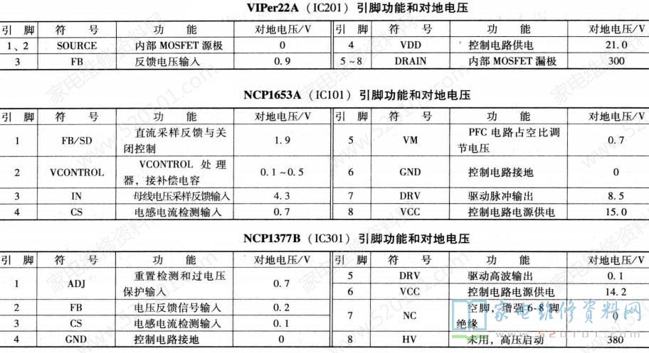 测量熔丝F101、F102和限流电阻THIO1是否烧断,如果已经烧断,说明开关电源存在严重短路故障。如果熔丝FP801未断,测量副电源无电压输出,首先测量VIPer22A的5 ~8脚有无300V电压。如果无300V电压,检查市电输人电路及整流桥BD101和副电源二次整流滤波电路D201A、D201、R201 ~ R203是否发生开路故障。如果有300V电压,则检测VIPer22A的1 ~4脚电压和对地电阻,判断VIPer22A是否损坏。