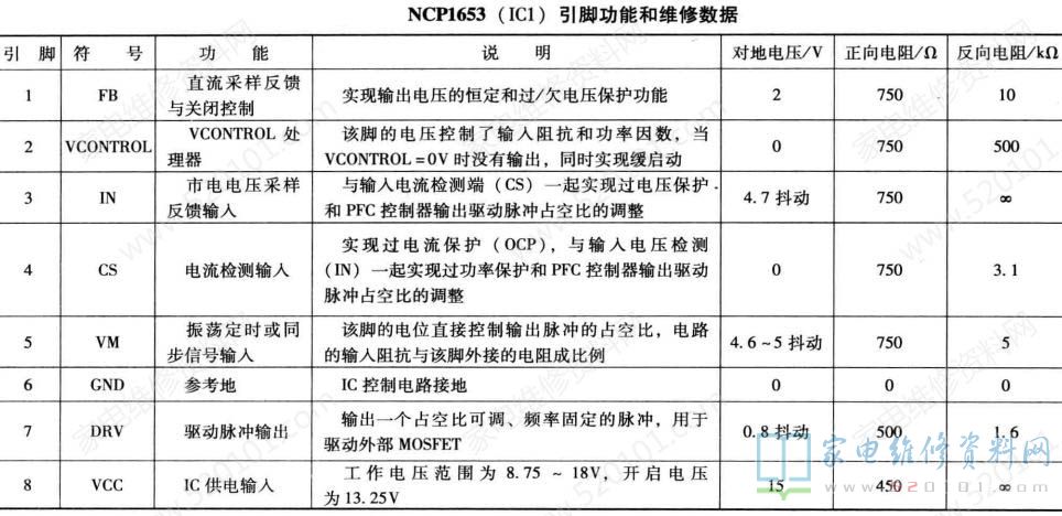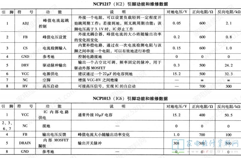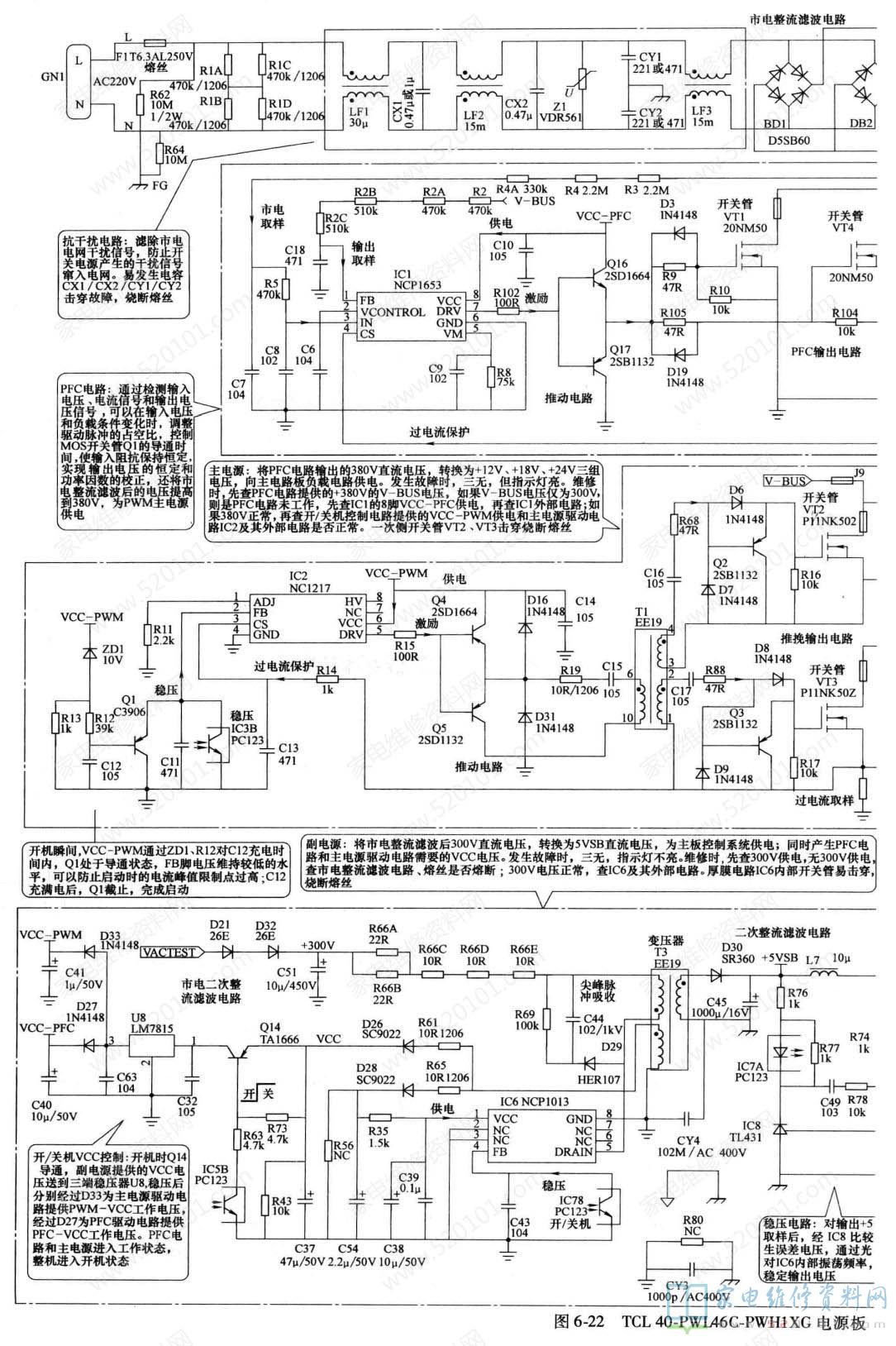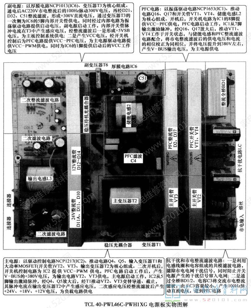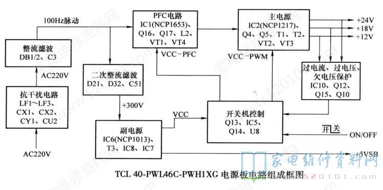 该电源板集成电路采用NCP1013 (IC6) + NCP1653 (IC1) + NCP1217 (IC2)组合方案。TCL 40-PWL46C-PWH1 XG电源板由三部分组成: 一是以厚膜电路 NCP1013 (IC6)为核心组成的副开关电源,为主板上微处理器控制系统提供+ 5VSTB供电,同时为PFC电路提供PFC-VCC电压,为主开关电源驱动控制PWM电路提供PWM-VCC工作电压;二是以驱动控制电路NCP1653 (IC1)和大功率MOS-FET (开关管) VT1、 VT4为核心组成的PFC电路,校正后为主开关电源提供约380V的工作电压;三是以驱动控制电路NCPI217 (IC2) 和大功率MOSFET (开关管) VT2、 VT3为核心组成的主开关电源,为负载电路提供+12V、+18V、 +24V 电压。