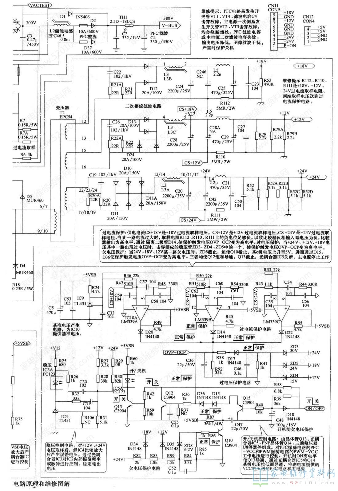 在开机的瞬间,测量保护电路Q12的基极电压,该电压正常时为低电平0V。如果开机时或发生故障时,变为高电平0.7V以上,则是过电压、过电流、欠电压保护电路启动。确定保护之后,可采取解除保护的方法,开机测量开关电源输出电压和负载电流,观察故障现象,确定故障部位。为了防止开关电源输出电压过高,引起负载电路损坏,建议先接假负载测量开关电源输出电压,在输出电压正常时,再连接负载电路。全部解除保护:一是将Q12的基极对地短接,解除保护,开机观察故障现象。逐路解除保护:对于+24V、+ 18V、+ 12V过电压保护电路,断开R38或分别断开ZD3 ~ ZD5;过电流保护电路,断开D14、D20、 D22;欠电压保护电路,断开DI5。每解除- - 路保护检测电路,进行一次开机实验,如果断开哪路保护检测电路后,开机不再保护,则是该路保护检测电路引起的保护。TCL 40-PWI46C-PWHl XG电源板电路原理和维修图解如图3所示。