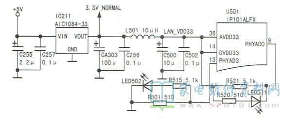 接下来测量U501供电端14、36脚电压不足+2.8V,手摸给U501供电的直流电压变换块IC211 (AIC1084-33)温度较高,怀疑IC211的负载有短路或漏电现象。测量IC211输出电流,不足0.5A(IC211最大输出电流5A),说明IC211内部的开关管带负载能力差。换上一只MP1084-33后试机,U501的14、36脚的+3.3V电压正常,故障排除。试机约10min,手摸MP1084-33温升正常。
