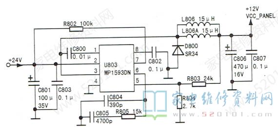 接修一台L37P10FBEG型液晶彩电,故障表现为灰屏。上电测量LVDS信号输出插座P204的10~38脚上有LVDS信号波形(直流电压为1.3V),说明主板上的主芯片工作正常。测量P204的①~④脚(vcc_ PANEL)电压为0V。该机上屏电压控制电路如图1所示,测U803②脚输入的+24V电压正常,但③脚输出电压却为0V。手摸U803的温度较高,怀疑U803输出短路。测量U803的③脚对地电阻为不稳定的几十欧姆。试用断开法检查,发现滤波电容C806( 470uF/16V )漏电严重。更换C806后试机,故障排除。