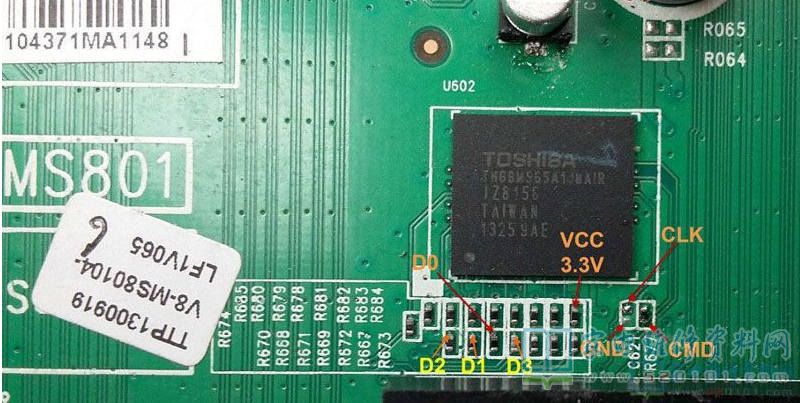 TCL B55A858U液晶电视(MS801机芯)EMMC飞线点位图 2022-06-18 02:33:27 阅读 1000 次 评论 0 条 摘要: TCL B55A858U液晶电视 ,采用MS801机芯主板,EMMC飞线读写VCC、CLK、D0、D1、D2、D3、CMD、GND点位如下图所示,仅供参考。 TCL B55A858U液晶电视 ,采用MS801机芯主板,EMMC飞线读写VCC、CLK、D0、D1、D2、D3、CMD、GND点位如下图所示,仅供参考。 版权声明:本文为转载文章,版权归原作者所有,欢迎分享本文,转载请保留出处! 点赞 分享: PREVIOUS:创维32X5液晶电视灰屏但有声音的故障维修 NEXT:三星UA55KS7300液晶电视无边框后盖的拆卸方法(图) 文章导航