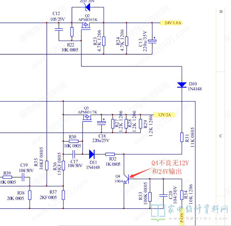 TCL L32F3260液晶电视不定时黑屏的故障维修 2022-06-18 17:46:50 阅读 744 次 评论 0 条 摘要: 接修一台TCL L32F3260液晶电视,故障表现为不定期黑屏,拆机检查发现黑屏时无24V电压输出。再查为Q4不良,换后长时间试机正常,此故障为通病故障,故障点如下图所标注。 接修一台TCL L32F3260液晶电视,故障表现为不定期黑屏,拆机检查发现黑屏时无24V电压输出。再查为Q4不良,换后长时间试机正常,此故障为通病故障,故障点如下图所标注。 版权声明:本文为转载文章,版权归原作者所有,欢迎分享本文,转载请保留出处! 点赞 分享: PREVIOUS:海尔H55E17液晶电视自动关机的故障维修 NEXT:影逸NE-32F301CN16液晶电视指示灯不亮不开机的故障维修 文章导航