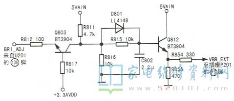 接修一台TCL L42P10BD型液晶彩电(MS68机芯),故障表现为黑屏(伴音正常)。观察背光灯管未亮。故障原因一是背光电路异常,二是U201 90、136脚未发出屏幕点亮及亮度控制信号,三是信号电平转换电路异常。经查,U201 90脚为低电平;在按动亮度增加键时,136脚电压能从0v逐渐增加,说明故障在背光电路或信号电平转换电路中。先对电平转换电路进行检查,如图1所示,发现控制管Q812(BT3904)已开路。更换Q812后开机,故障排除。
