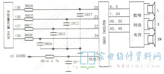 接修一台L46F19BD型液晶彩电(MS68机芯),无声音。为了判定故障范围,在AV状态下注入影碟机信号,用示波器观察功放块U601 (TAS5706)的信号输入端25、23、22、34脚波形,发现波形正常,而输出端4、1、49、45脚却没有信号波形。测U601的+24V及+3.3V供电均正常,且28、29脚总线电压(约3V)、21脚静音电压(低电平静音,实测为+2.8V )也正常,怀疑U601已损坏。考虑到该数字功放块有复位端,如图1所示。