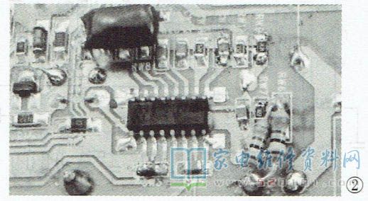 测IC3 (L6599) ⑦脚电压已在正常范围内,但11、15脚无输出。在线测IC3各脚对地阻值,发现⑤脚对地阻值仅几百欧姆。IC3 的外围电路如图1所示,IC3⑤脚对地阻值应该比较大。检查IC3⑤脚外围电路,发现电容CW20漏电。用一只103涤纶电容代换后试机(见图2),+12V及+24V输出正常,电源板上机,图声正常,故障排除。