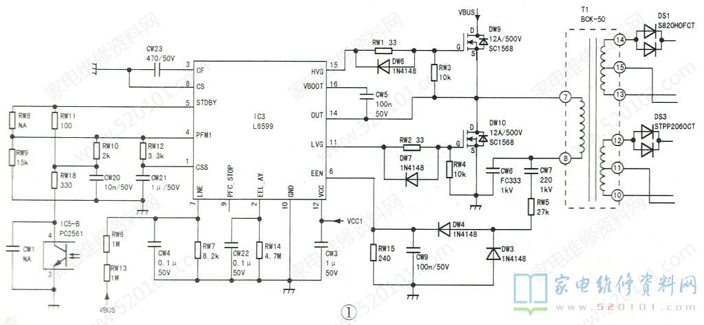 提示:L6599的⑤脚(STDBY)是待机控制端,当该脚电压高于1.25V时,芯片启动;电压低于1.25V时,芯片进入待机状态。电容CW20漏电后,⑤脚电压低于1.25V,芯片进入待机状态。