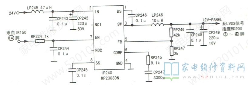 首先,要确认是过压还是过流问题导致不能开机。在按下“开/待机”键后迅速检测相关输出电压,结果均未发现异常;在待机指示灯闪烁过程中,查送往背光板12V电压过流保护电阻RP010并不发热,也未开路,表明故障不在背光板。再重新试机,发现12V-PANEL电压控制输出块IP240(相关电路如图1所示)在待机指示灯闪烁过程中严重发热,且12V-PANEL电压不足11V(待机指示灯闪烁期间),待机指示灯变为常亮后电压变为0V,表明IP240的负载,即逻辑板或显示屏电路存在过流故障。顺藤摸瓜检查,当检查到逻辑板上时,发现在待机指示灯闪烁过程中,LVDS信号驱动块AF15-F烫手。将其更换后试机,故障排除。