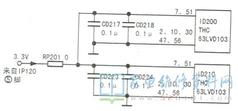DC/DC变换块IP120 (MP1411)⑤脚输出3.3V电压,经保险电阻RP201送出。查IP120⑤脚输出电压为0V,但输入端④脚的12V电压正常。查IP120外围元件正常,怀疑IP120损坏,但换新后开机,IP120输出电压不足2V,且温升很高,随即降为0V。考虑到IP120具有输出过流、过热保护功能,故障极有可能是IP120负载短路,导致IP120因过流而保护。这将导致IH200、ID200/210、ID300等众多IC对LVDS信号的处理与存储工作无法进行,从而形成本故障。经查, 滤波电容CD223(0.1uF )严重漏电。更换CD223后开机,3.3V电压恢复,故障排除。