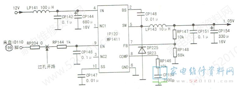 测量IP120输入端④脚12V输入电压正常,但⑤脚输出为0V,且手摸IP120无明显温升,怀疑IP120并未工作。测IP120使能端⑨脚电压为OV,正常时应为高电平。经查,RP204至RP144之间的过孔开路。用一段导线连接RP204、RP144后:试机,1.05V电压恢复正常,故障消失。