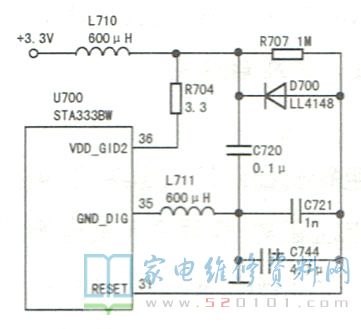 接下来测U700的信号输入端27~30脚波形正常,但⑨、⑥、13、10脚却没有信号波形。重点检查U700静音端23脚电压,发现为正常的2.8V。该数字功放设有开机复位电路,如图1所示。在刚开机时,U700复位端31脚为低电平,+3.3V电压一路经R704送到U700的36脚,另一路经R707对复位电容C744充电。当C744正端(即U700复位端)电压达到3V时,开机复位过程结束,U700进入正常工作状态。检查复位电路,发现充电限流电阻R707已开路。换新R707后试机,故障排除。