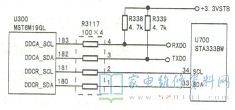 该型彩电的总线通讯器件除存储器、高频头外,还有数字音频功放U700,如图1所示。U700 33、34脚通过排阻分别与U300的180、181脚相连。在红色待机指示灯闪烁期间,测得u700 33、34脚电压约为0V。断电检查,发现U700主电压供电端⑧、11脚对地电阻接近0Ω,显然U700已损坏。换新U700后开机,故障排除。此时测得U700 33、34脚电压约为+3V。