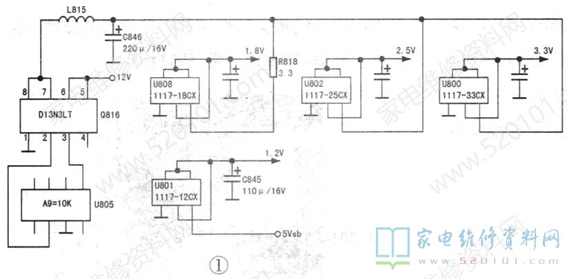 例2:一台TCL C32E320B型液晶电视,不开机。分析检修:检查方法同“例1”,确认故障在主板上。测主板上U801输出电压仅0.6V,正常值应为1.2V。测U801③脚输入的5Vsb电压正常,更换滤波电容C845无效。代换U801后试机,故障排除。
