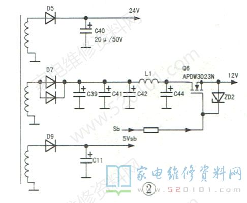例1:一台TCL C32E320B型液晶电视,不开机。分析检修:上电后,测开关电源输出的5Vsb电压正常,C39两端电压为14V(正常),C40两端电压为24V (正常),但Q6的S极无12V电压输出。相关电路如图2所示。