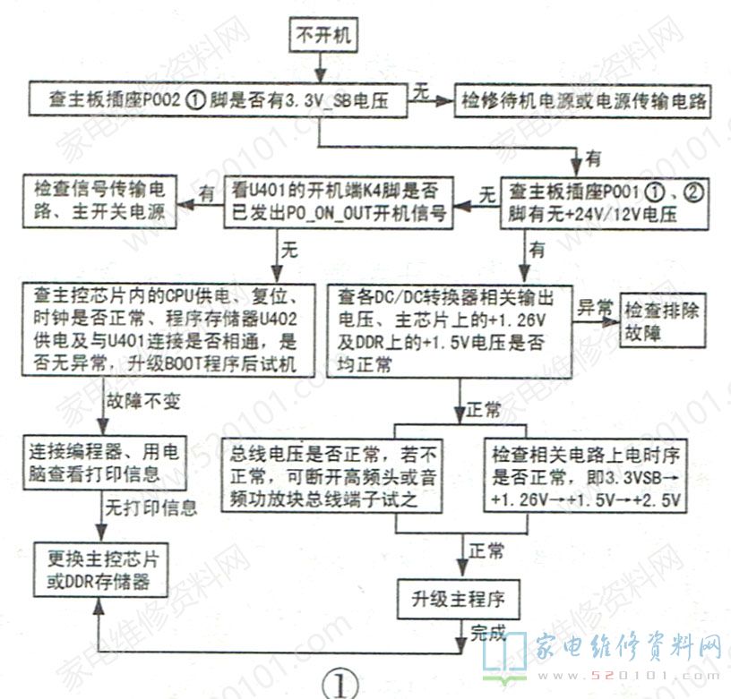 不开机故障比较常见,其检修框图如图1所示。