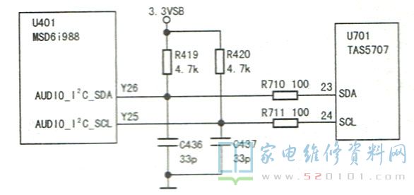 接修一台TCL L42E5300A型液晶彩电(MS99机芯),按“待机”键后指示灯闪烁五六秒后重新点亮( 正常时应熄灭),但不开机。待机指示灯闪烁后又重新点亮,表明开关电源基本正常,故障原因可能是系统在运行开机程序中遇到阻碍。在待机指示灯闪烁期间(多次开机测试),测插座P001①、②脚(开关电源送来的+24V)电压正常,测量相关DC/DC转换IC输出电压也正常。接下来测量U401(MSD6i988)与U701的I2C总线电压(相关电路见图1),发现I2C_SCL(时钟线)电压竟为0V(正常约为+3V )。当断开与U701(TAS5707 )24脚的连接后再测电压仍为0V,看来总线供电电路有问题。检查发现时钟线上拉电阻R420虛焊,补焊后试机,故障排除。