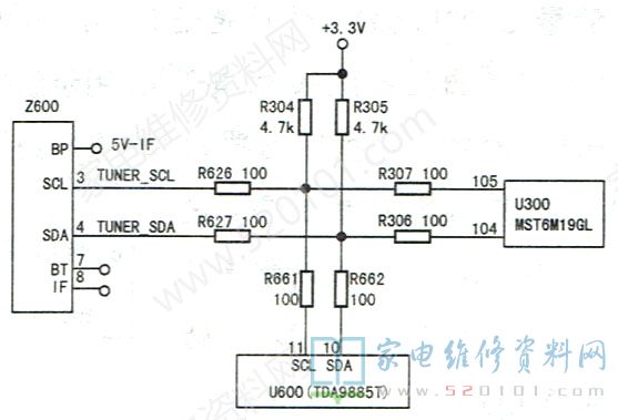 接修一台TCL L46E9SFE型液晶彩电(MS91C机芯),二次不开机(红色待机指示灯虽能闪烁,但很快变为常亮)。按二次开机键后红色待机指示灯闪烁,说明主电源已经工作,且系统已经在运行开机程序。待机指示灯停止闪烁,变为常亮,说明系统在运行开机程序过程中遇到阻碍而终止。在二次开机后,系统会初始化DDR、FLASH、EEPROM存储器,接下来再对i2C总线上所挂器件(或单元电路)进行初始化。测得FLASH、EEPROM存储器的供电及总线电压正常,但高频头③脚TUNER _SCL端子电压为0V。高频头③脚通过R626、R307与U300 105脚相连,如图1所示。试断开高频头③脚,测U300 105脚电压仍然为0V,说明电压异常与高频头无关。接下来断开中放块U600( TDA9885T )11脚,这时U300 105脚电压升为正常值3V,显然U600有问题。更换U600后试机,U300 105脚时钟电压恢复正常,故障排除。