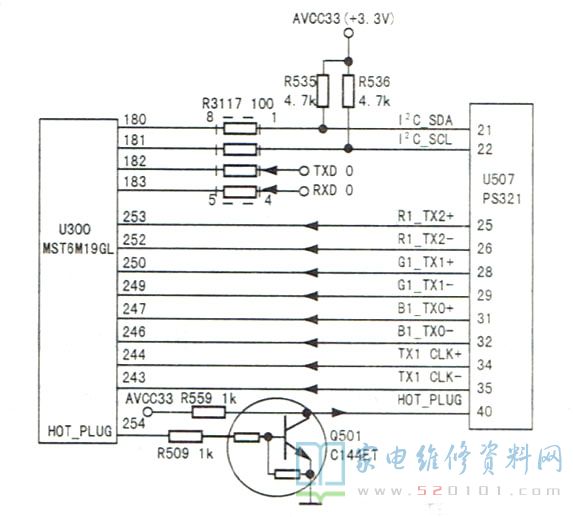 接修一台TCL L40M9FE型液晶彩电,在HDMI状态下无图像。首先确认电视机处于HDMI信号输入状态,然后测量U507(PS321,作用是进行HDMI/DVI数据转换及输出控制)3.3V供电正常。用示波器检查U507的时钟与数据输出端25、26、28、29、31、32、34、35脚,没有输出信号波形。测量HDMI/DVI(高清晰度多媒体接口/数字视频接口)状态转换控制管Q501(C144ET)的b极电平,发现能高、低变化,但U507的工作状态控制端40脚却始终为高电平(相关电路见图1),怀疑Q501损坏,拆下检查,发现Q501的b-e结已开路。更换Q501后试机,故障排除。