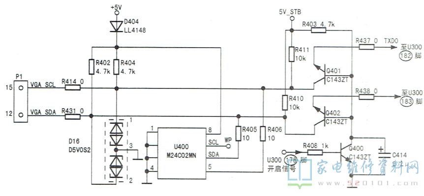 在升级软件时, 测U300 178脚输 出低电平,但U300 182、183脚没有变化的信号波形。检查Q400~Q402及偏置电路,均未发现异常。用万用表测量输入端对地电阻,RXD、TXD对地电阻分别为3.5kΩ和7kΩ。测量正常机此处正常阻值约为7kΩ。显然,RXD(即VGA-SDA )线路上有元件漏电。怀疑VGA显示格式数据存储器U400(M24C02MN )损坏。将其换新后试机,故障排除。