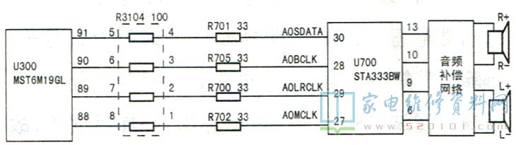接修一台TCL L42E9FE型液晶彩电(MS91C机芯),故障表现为无声音。该机输入的音频信号先经U300选择(模拟音频信号还要经过D/A转换)及音效处理后,从U300的88~91脚输出,通过排阻R3104送给数字功放块U700 (STA333BW) 的27~30脚,最后从U700 6、9、10、13脚输出,如图1所示。