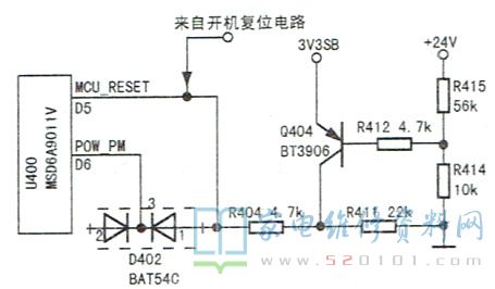 接修一台TCL 50E5690A液晶电视(MS901K机芯),按下“待机/开机”键后,红色待机指示灯亮但没闪烁,不能二次开机。经查,主板上的插座P001 10脚未输出正常的开机高电平。主芯片U400的3.3V供电和时钟振荡、复位电压均正常。为了查找故障,将3V3SB电压接至P001 10脚强制开机, P001②脚输出+24V电压,说明主电源已工作。此时待机指示灯闪烁了几下后停止闪烁,仍然不能开机。怀疑FLASH存储器U402 (W25Q16-00B)中的数据有问题,但更换后故障依旧。该机芯设有断电检测复位电路,如图1所示。