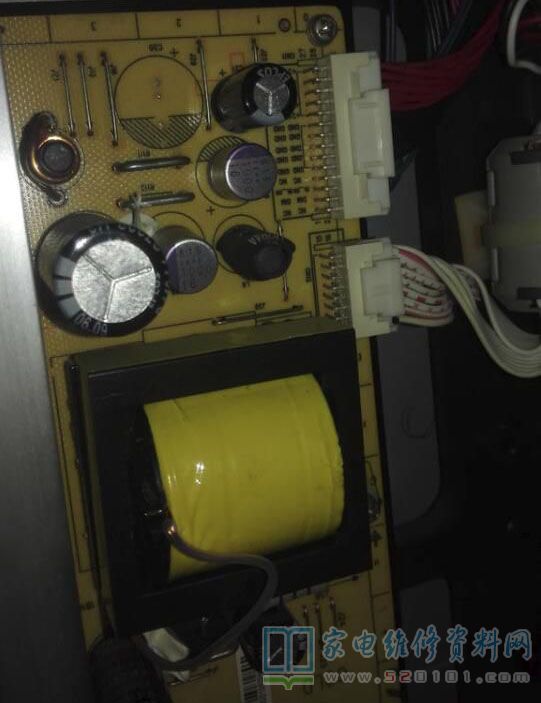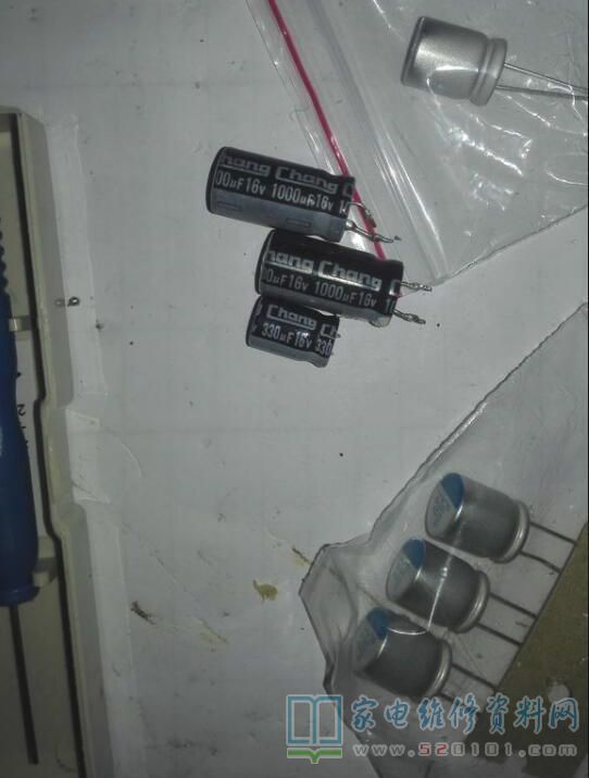 接修一台TCLL52E9FBD液晶电视,故障表现为遥控失灵,不能开机,打开后盖发现电源板滤波电容C28和C29鼓包,主板电容C834外观看不出好坏,因当时未搜索电源板电路图,遂按照板上容量在某宝购此两种黑金刚固态电容,另加电源板上电容C21以备万一。3天后快递送到,电源板用1000μF/16V固态电容换掉已经鼓包的相同规格电解电容,安装上机,结果仍然不能开机,最后只好换掉主板电容C834,这个电容太难拆,折腾10几分钟终于清理掉旧电容,最后安装后一次搞定,正常开机。