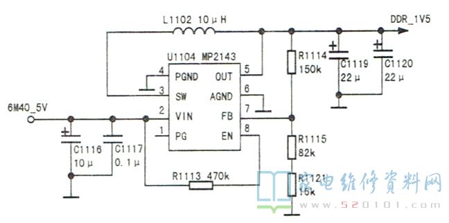 进一步测量发现,在待机指示灯闪烁期间,U400的3V3SB、+3V3、+2V5及内核+1V15供电均正常,但U400内DDR缓存器的DDR 1V5 供电却为0V。进而测量DDR3存储器U1301 ~U1304(K4B2G1646C)的DDR 1V5供电也为 0V。DDR 1V5 电压是通过两步变换得到:第一步是+24V电压经DC/DC转换器U1105 ( TPS54331)得到6M40_ 5V,第二步是6M40_ 5V电压经DC/DC转换器U1104( MP2143 )得到DDR 1V5,如图1所示。