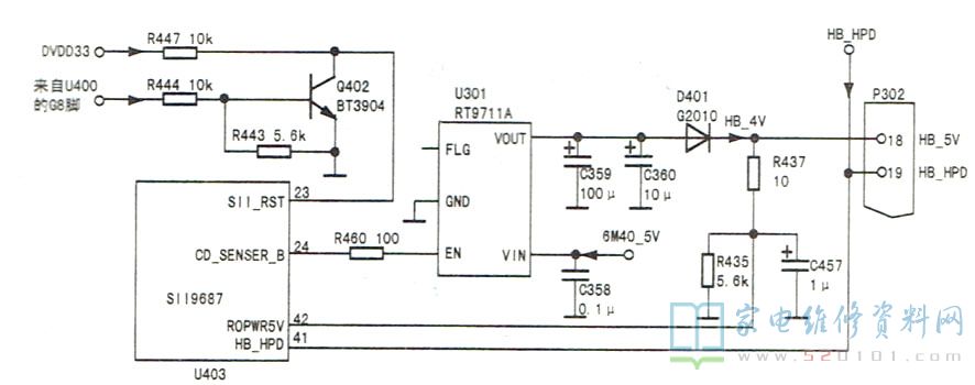 接修一台TCL L65E5700UDS液晶电视(MS901K机芯),不能播放MHL(移动终端高清影音接口)信号。该机芯的MHL信号是经插口P302输入,如图1所示。当信号选择开关U403(SiI9687) 的41脚没检测到P302 19脚送来的HB_HPD( +5V )电压时,U400会通过总线让U403选择MHL信号。同时,U400的G8脚输出高电平->控制管Q402( BT3904)导通->其集电极输出低电平->U403 23脚被低电平复位,U403的24脚输出高电平,U301(RT9711A)为U403的42脚及P302 18脚提供+5V电源,此时系统按MHL信号的格式和速率进行解调和传输(MHL信号传输速度是HDMI信号的3倍,可达2.2Gbit/s),再由信号识别及倍频处理器U1202( 6M40 )进行识别处理,然后送往逻辑板。