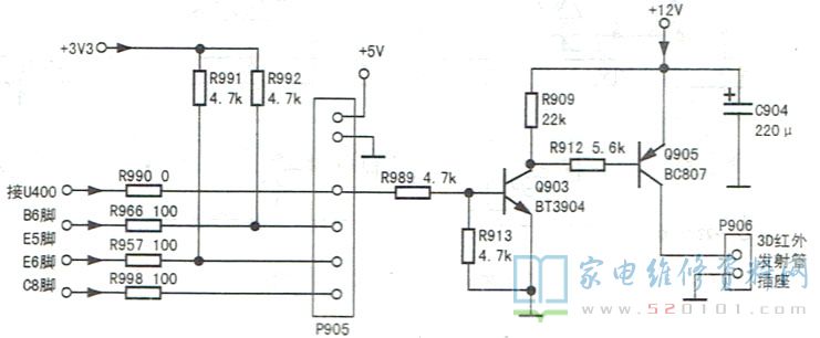 接修一台TCL L55H6600A-3D液晶电视(MS901K机芯),没有3D效果,且3D眼镜上的工作指示灯处于闪烁状态。佩戴该机眼镜观看其他具有3D功能电视中的3D图像,有正常的3D效果,显然故障机内的3D效果电路异常。查U400的C6端已发出3D模式启动的高电平信号,接着检查蓝牙3D发射接口电路,如图1所示,发现插座P906中有一个插头氧化,用无水酒精清洗并烘干后试机,故障排除。