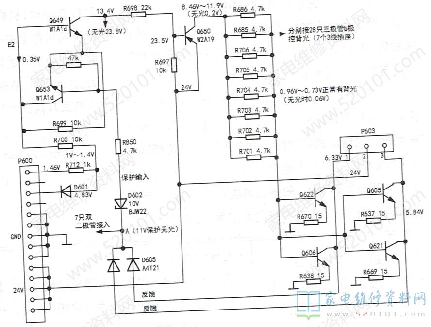 插座 P603②脚为+24V供电端,①、③脚是LED控制端,均外接一对NPN的贴片三极管。背光亮时,P603的①、②及②、③端间均有约17.5V的电压,给两组LED供电。估计每组LED可能有五六只灯珠。LED控制端通过贴片双二极管(D605)将反馈信息送到保护端入口A点。实测发现,当A点电压(正常值为5.6V~7.15V )升至11V时,背光不亮,这时P603的①、③端电压升至11V(正常时约为6.2V)。为降低保护灵敏度,将D602换为12V稳压二极管,上电开机,故障不再出现。