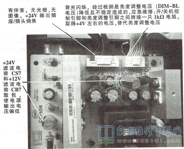 接修一台TCL 140E9F型液晶彩电,有伴音,无光栅。拆机,发现背光板上的+24V输出连接器烧焦、断线,如图1所示。将24V连接线直接焊接到对应焊点后通电试机,背光亮,但时而出现闪烁现象,尤其是图像亮度较暗时。