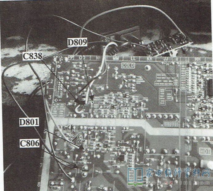 接修一台TCL T42F19F型液晶电视,故障表现为电源指示灯不亮,不开机。拆开机壳,目测电源二合一板(型号:40-IP42CS -PWJIXG)上无明显损坏的元件。检测后发现待机电源电路中电阻R801 R802.R825均烧坏,电源集成块U801(FSQ510)引脚间阻值很小,已损坏。由于这几个贴片电阻阻值已无法辨认,加之手头又没有FSQ510,决定改动电路应急维修该故障,具体更改方法如下: