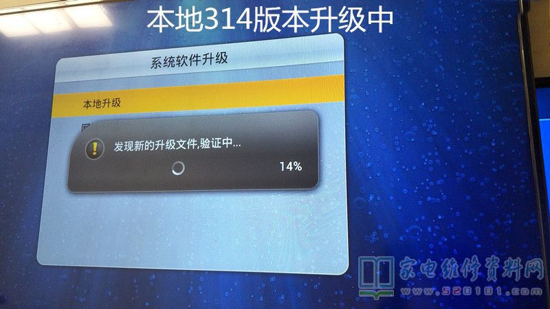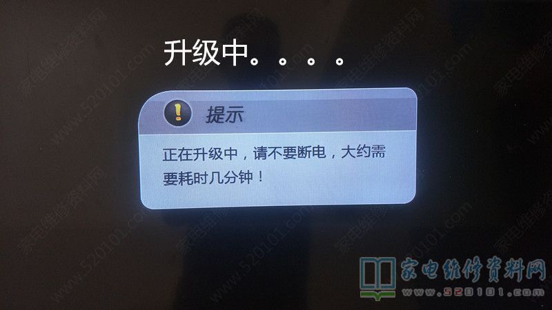 换回原数据后,继续找023版本升级软件(TCL V8-0MT5508-LF1V023软件升级刷机数据包),在网上下了一个,自己那个因硬盘有坏道暂时停用的电脑上找到一个,先把网上的固件放到U盘根目录下,U盘还是那个1G的U盘,但度娘说过升级用的U盘容量,过小不易,过大不易,扩容水货不易,否则升级容易失败。(自己的U盘除了一个电脑系统安装盘是8G,其他都是32G的,里面装满了自己认为是宝贝的东东,先用1GU盘试试再说)。U盘插到电视上,按住待机键,上电遥控开机,一会屏幕亮了,进入升级模式。