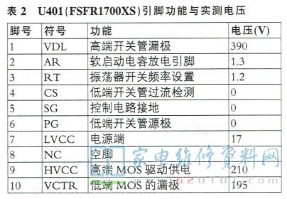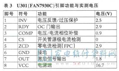 故障现象3:电源带负载能力差。分析检修:检查FPC电路输出的VBUS(+390V)电压是否正常,如果明显偏低,应查VB电压(约+300V )是否正常,如不正常,则检查市电整流滤波电路;若正常,则表明PFC电路存在故障,重点检查R307 ~R310.CE2、CE3、QW3等元件。U301( FAN7930C )引脚功能及电压见表3。